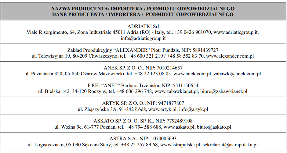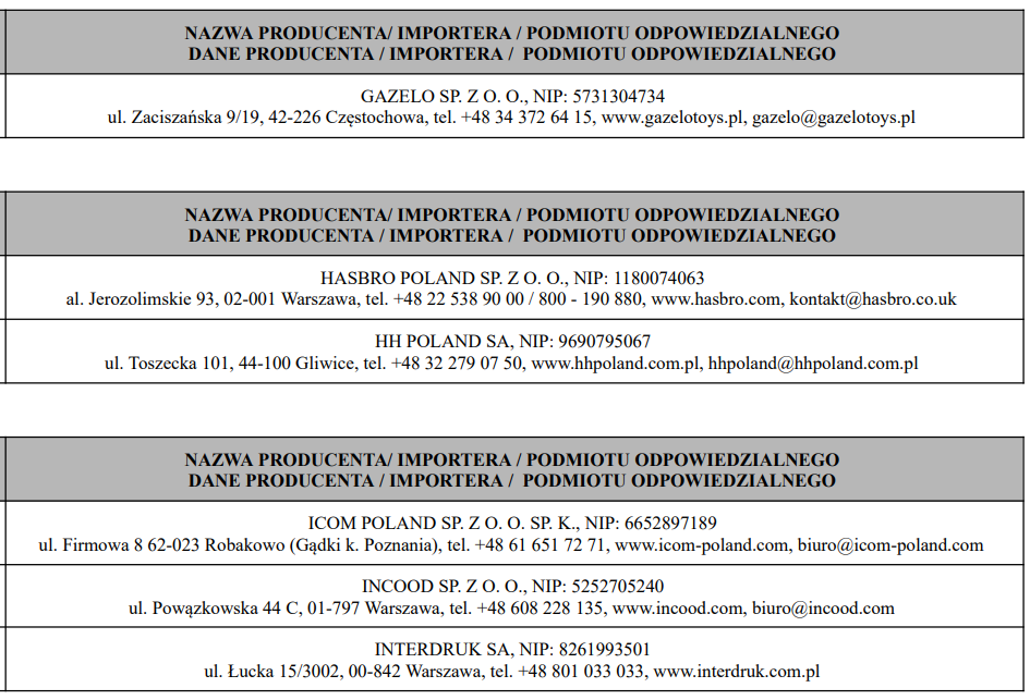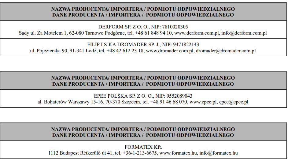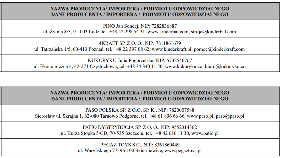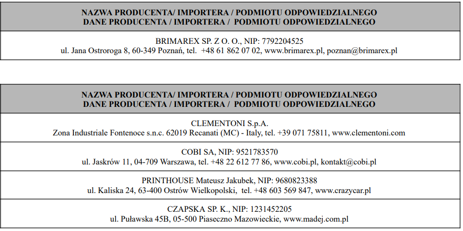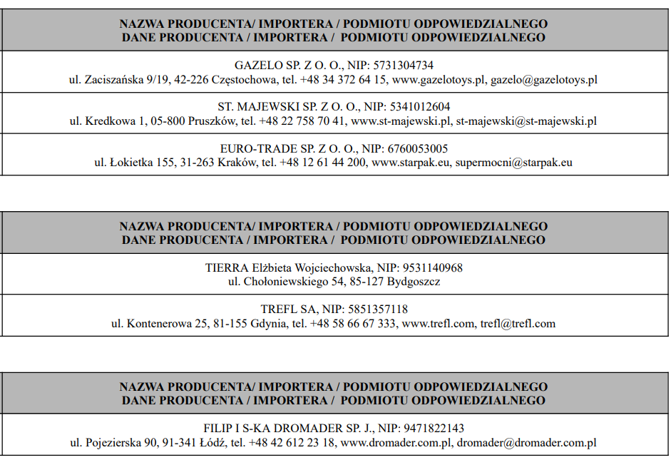 Poniżej w tabelach znajduje się wykaz producentów/importerów/podmiotów odpowiedzialnych.