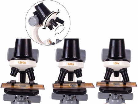Dzięki obrotowej głowicy mikroskop posiada trzy rodzaje powiększenia 100x, 400x, 1200x.